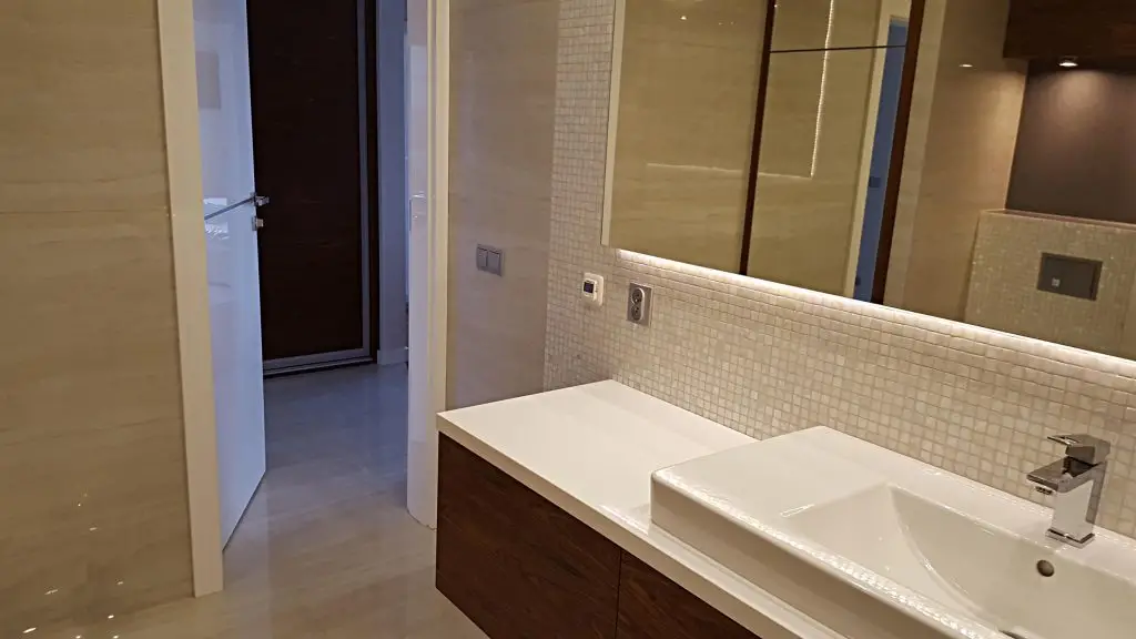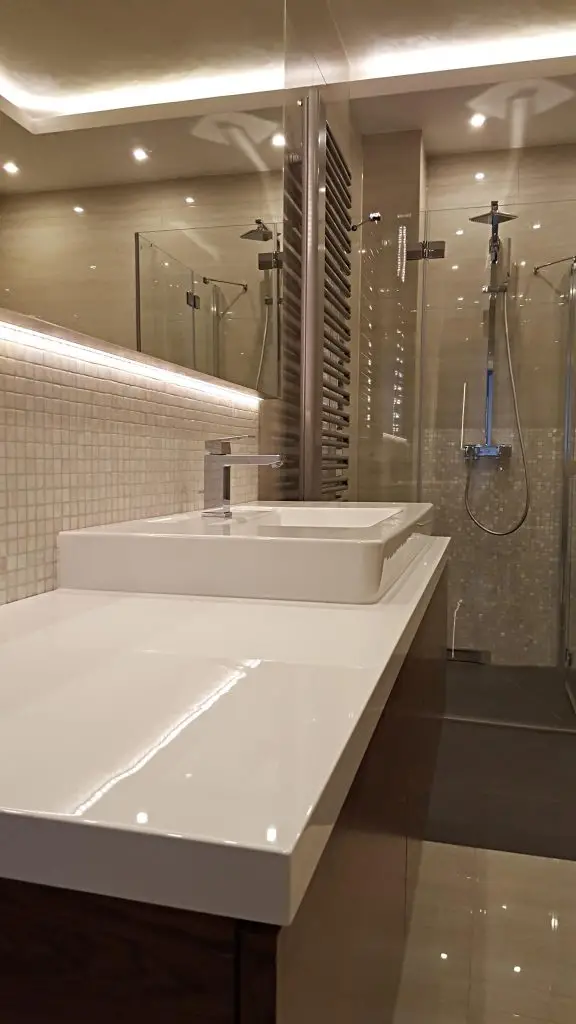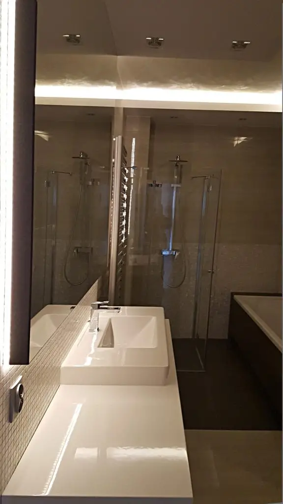 Meble łazienkowe zostały wykonane z forniru w kolorze orzechowym. Pod umywalką znajduje się długa, praktyczna szuflada. Sufit łazienki wykończono tynkiem dekoracyjnym Velutti w kolorze perłowym.