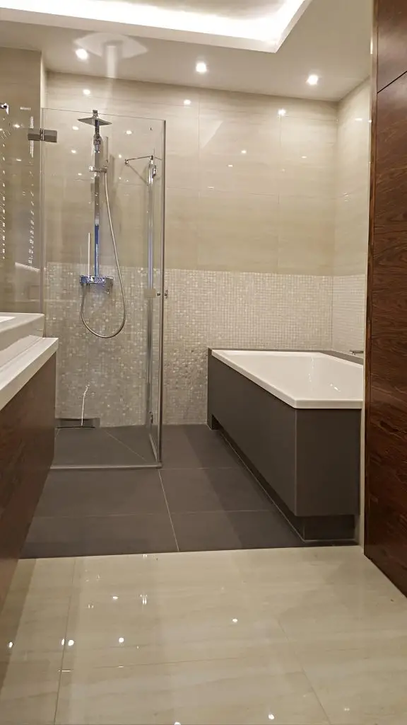 Łazienka tworzy prosty, funkcjonalny układ. Został tu połączony szary matowy gresu z pięknymi, błyszczącymi włoskimi kaflami. Całość została przełamana perłową mozaiką.